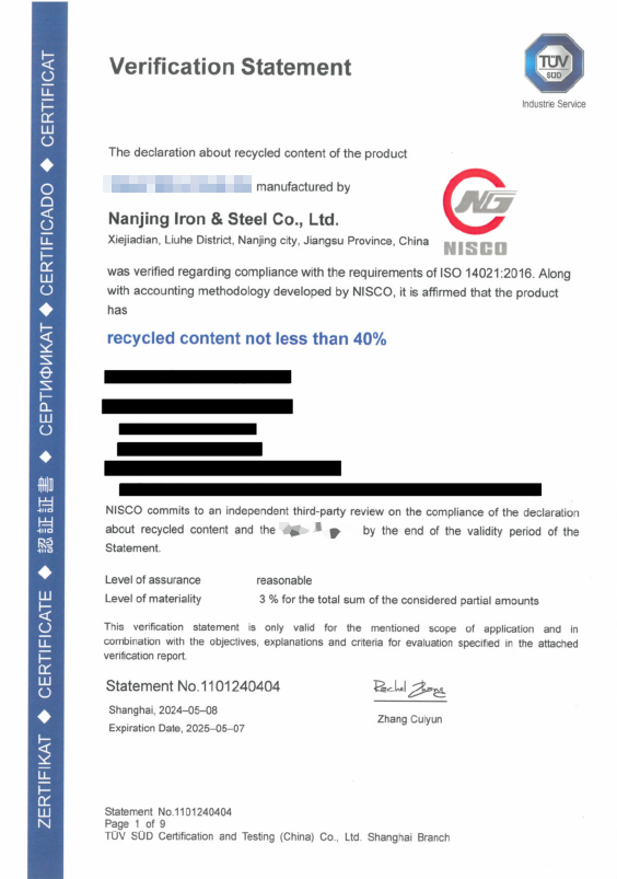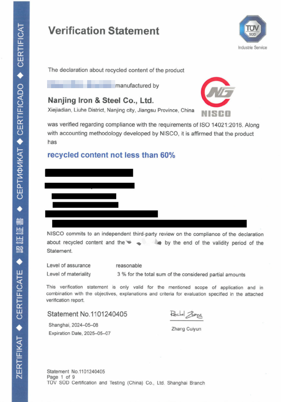 近日,南鋼某線材高端產(chǎn)品順利通過(guò)第三方權(quán)威認(rèn)證機(jī)構(gòu)TUV南德認(rèn)證,獲得ISO 14021再循環(huán)含量認(rèn)證證書(shū)。本次認(rèn)證范圍涵蓋了40%以上、60%以上和100%高廢鋼比例生產(chǎn)的某線材高端產(chǎn)品。此項(xiàng)認(rèn)證的獲得不僅是對(duì)南鋼環(huán)保理念和實(shí)踐的認(rèn)可,更對(duì)企業(yè)綠色競(jìng)爭(zhēng)力和可持續(xù)發(fā)展產(chǎn)生積極的影響。