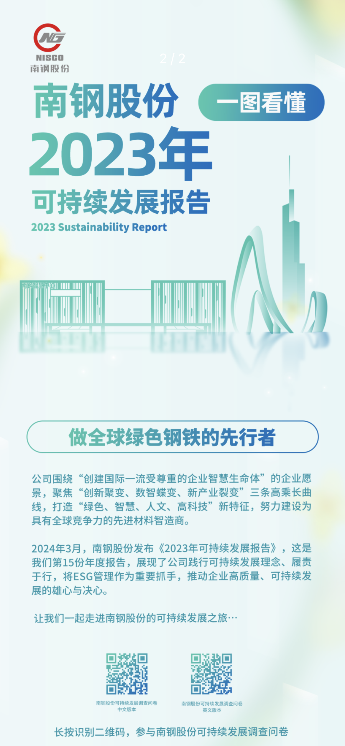 南鋼致力于“做全球綠色鋼鐵的先行者”,已多年堅持可持續(xù)發(fā)展戰(zhàn)略、踐行ESG管理與實踐,堅持“環(huán)境友好、立業(yè)為善”的理念。(1)在公司治理方面,2021年,公司將董事會下設的“戰(zhàn)略委員會”調(diào)整為“戰(zhàn)略與ESG委員會”。2023年,公司成立低碳與能源戰(zhàn)略委員會,統(tǒng)籌協(xié)調(diào)公司低碳與能源推進工作。現(xiàn)已建立覆蓋決策層、監(jiān)督層、執(zhí)行層各個層級,分工負責、權(quán)責清晰的ESG管理架構(gòu)與制度;積極開展與利益相關(guān)方的溝通,滿足合理訴求。同時,以利益相關(guān)方重點關(guān)切作為公司重要風險和機遇,發(fā)起“南鋼可持續(xù)發(fā)展問卷調(diào)研活動”,強化公司風險管理。(2)在環(huán)境保護方面,針對氣候變化等重要議題,公司按照源頭減碳、過程降碳、末端固碳的總體思路,實施“碳十條”行動綱要和六條技術(shù)路線,并重點構(gòu)建“N-ZERO”零碳三大體系。公司從創(chuàng)新綠色產(chǎn)品、創(chuàng)新綠色低碳技術(shù)、優(yōu)化能源結(jié)構(gòu)、參與低碳標準制定、布局廢鋼資源、綠色物流、綠色投資等多方面、多渠道踐行減碳。公司通過“有組織”“無組織”“清潔運輸”的全流程、全工序超低排放改造,成功創(chuàng)建江蘇省“長流程”鋼鐵行業(yè)首家“環(huán)保績效A級企業(yè)”。日前,南鋼儲能項目正式竣工并網(wǎng)運行,這是國內(nèi)單體功率最大的用戶側(cè)儲能項目。(3)在社會責任方面,公司堅持科技創(chuàng)新驅(qū)動產(chǎn)業(yè)發(fā)展,研發(fā)投入占比連續(xù)多年保持3%以上。創(chuàng)新打造以高強、耐磨、耐蝕、復合板為核心的全生命周期低碳產(chǎn)品;助力鄉(xiāng)村振興,通過捐資助學、醫(yī)療援助、消費助農(nóng)等方式為定點幫扶地區(qū)鄉(xiāng)村振興工作賦能。自2018年以來,連續(xù)6年開展“星光合伙人”全國鄉(xiāng)村醫(yī)生健康幫扶項目;推進深層次產(chǎn)城融合,公司打造了鋼鐵博物館、霸王山紀念館、江邊生態(tài)濕地園等一批景點,助推“工業(yè)+旅游”融合發(fā)展。