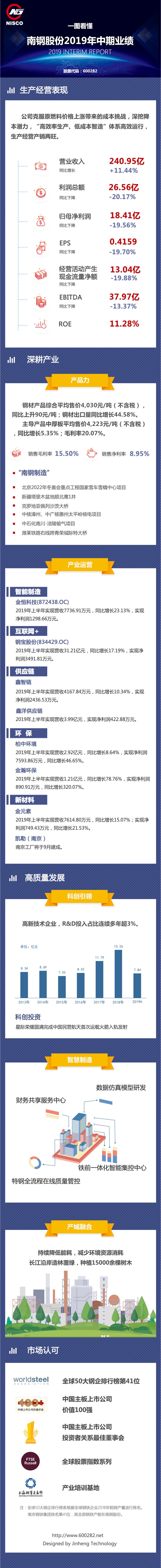 2019年08月26日晚,南鋼股份(600282.SH)披露了《2019年半年度報告》。報告期,南鋼股份產銷兩旺,生產鋼材503.02萬噸,同比增加30.08萬噸;銷售鋼材500.25萬噸,同比增加30.84萬噸;實現營業收入240.95億元,同比上升11.44%;實現歸屬于上市公司股東凈利潤18.41億元,同比下降19.56%;每股收益0.4159元,ROE 11.28%。在行業業績大幅波動的情況下,南鋼股份經營業績相對穩健。