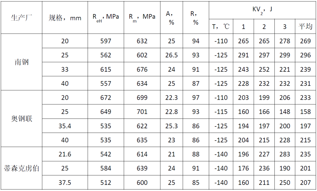 南鋼生產的5Ni鋼與國外相近規格5Ni鋼拉伸和低溫沖擊性能對比:南鋼5Ni鋼屈服強度范圍為557MPa~615MPa、抗拉強度范圍為602MPa~676MPa、斷后伸長率范圍為24%~26.5%、低溫沖擊吸收能量范圍為231J~296J;奧鋼聯5Ni鋼屈服強度范圍為532MPa~672MPa、抗拉強度范圍為622MPa~699MPa、斷后伸長率范圍為22.3%~25.3%、低溫沖擊吸收能量范圍為158J~233J;蒂森克虜伯5Ni鋼屈服強度為512MPa~584MPa、抗拉強度為600MPa~639MPa、斷后伸長率為21%~25%、低溫沖擊吸收能量范圍為201J~235J。