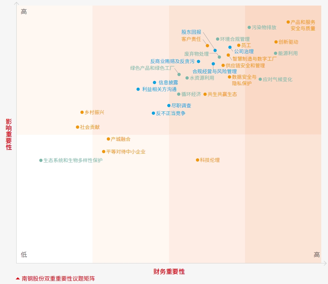 南鋼股份設(shè)立“環(huán)境友好、治理一流、科創(chuàng)引領(lǐng)、共生共贏”的 ESG 戰(zhàn)略目標(biāo),著力提升 ESG 管理水平,聚焦“創(chuàng)新發(fā)展與卓越產(chǎn)品、共享發(fā)展與員工成長(zhǎng)、綠色發(fā)展與環(huán)境友好、公司治理與共贏發(fā)展、和諧關(guān)系與社會(huì)責(zé)任”五大可持續(xù)發(fā)展層面,為員工謀幸福、為顧客謀發(fā)展、為股東增回報(bào)、為社會(huì)擔(dān)責(zé)任、為相關(guān)方創(chuàng)共贏,致力于實(shí)現(xiàn)“創(chuàng)建國(guó)際一流受尊重的企業(yè)智慧生命體”的企業(yè)愿景。